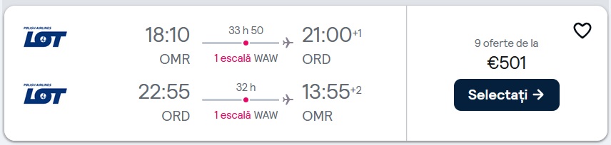 Astăzi am găsit pentru tine o ofertă de la LOT, compania aeriană poloneză, din diverse aeroporturi din România către Chicago, Statele Unite, de la 445 Euro dus-întors. LOT este o companie full-service, dar tariful de bază pe care ți-l propunem include doar bagajul de mână (troler). Toate zborurile propuse prevăd o escală la Varșovia. 🛫✨